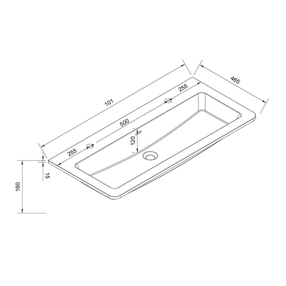 Umyvadlo lze zvolit keramické nebo z litého mramoru, obě varianty mají dva otvory pro baterie a jednu výpust.