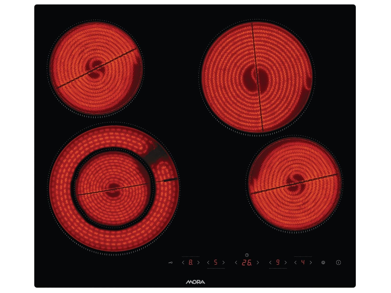 Varná deska sklokeramická MORA o šířce 59 cm a v barvě černá. Počet plotýnek je 4 a napájecí napětí (V): 220-240.