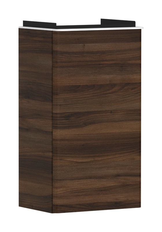 Závěsná skříňka pod umyvadlo bez umyvadla v barevném provedení tmavý ořech o rozměru 34x62,5x24,5 cm. S povrchem z MDF desky. Dvířka mají pravé otevírání.