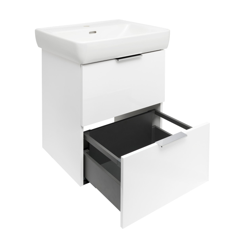 Závěsná skříňka pod umyvadlo bez umyvadla v bílé barvě s lesklým povrchem o rozměru 52,9x69,4x50,9 cm. S povrchem z MDF desky. S plnovýsuvem a dotahem.