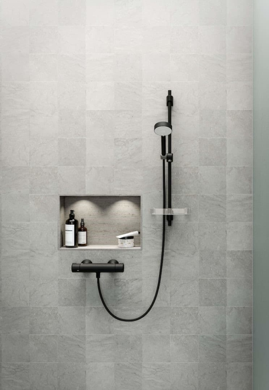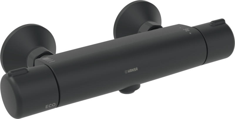 Termostatická nástěnná sprchová baterie bez sprchového setu. V černé barvě. Průtok baterie je 19,2 litrů/minutu. Rozteč baterie 150 mm. S matným povrchem.