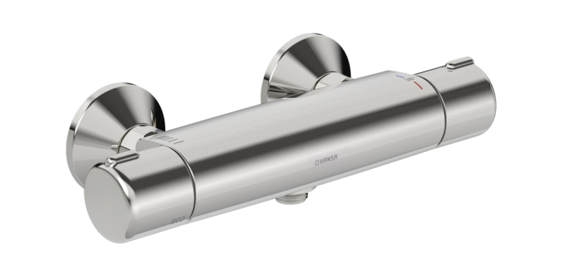 Termostatická nástěnná sprchová baterie bez sprchového setu. V chromovém provedení. Průtok baterie je 11,4 litrů/minutu. Rozteč baterie 150 mm.
