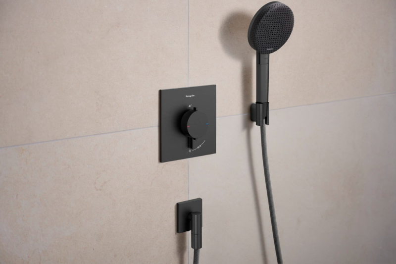 Termostatická podomítková sprchová baterie bez podomítkového tělesa. V barevném provedení černý chrom. Průtok baterie je 21,3 litrů/minutu. S matným povrchem
