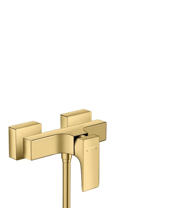 Páková nástěnná sprchová baterie bez sprchového setu. V hranatém designu. V provedení leštěného vzhledu zlata. Průtok baterie je 27 litrů/minutu. Rozteč baterie 150 mm.