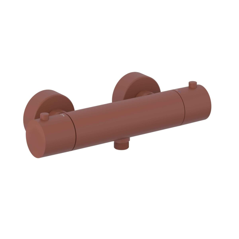 Termostatická nástěnná sprchová baterie bez sprchového setu v barevném provedení matná cihlová. Rozteč baterie 150 mm. S matným povrchem.