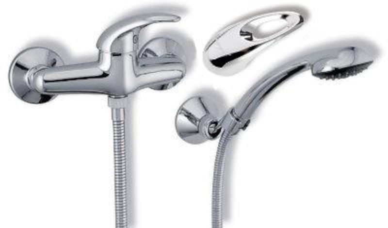 Páková nástěnná sprchová baterie se sprchovým setem. V chromovém provedení. Rozteč baterie 150 mm.