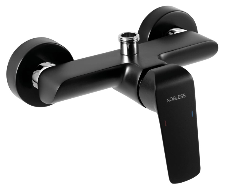 Páková nástěnná sprchová baterie bez sprchového setu. V černé barvě. Rozteč baterie 150 mm. S matným povrchem.