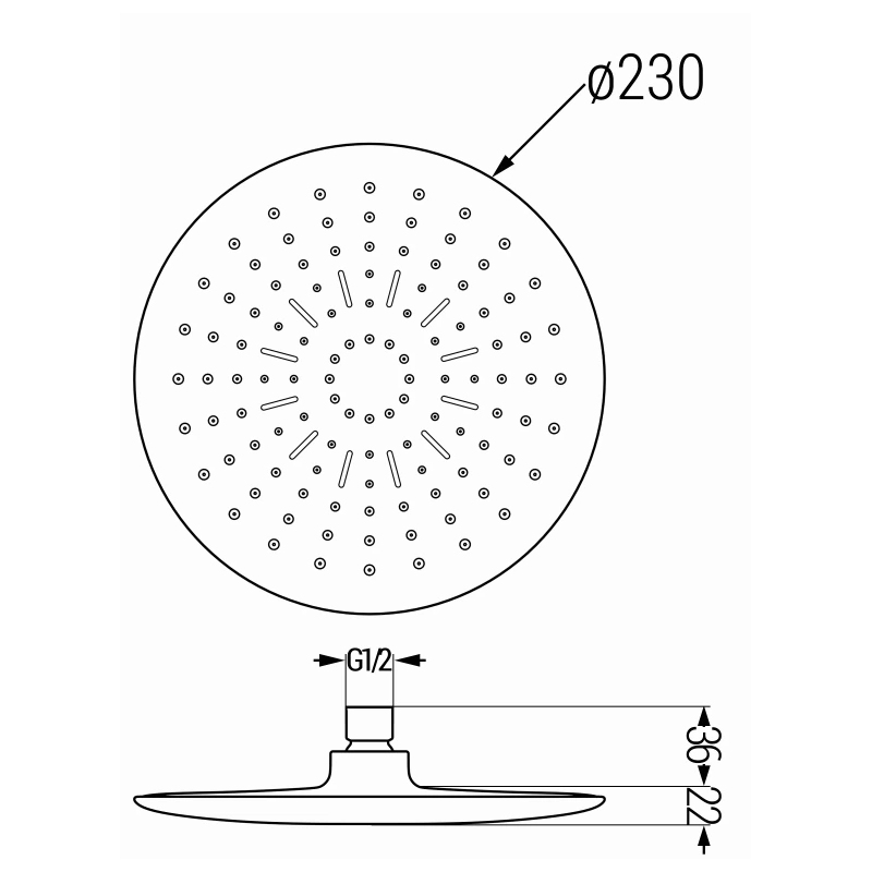 Specifikace produktu: Materiál: Plast Povrchová úprava: Chrom Rozměry: ø23 cm Tloušťka: 2,2 cm Standardní připojení G 1/2" Sprchová hlavice má gumové trysky, které zabraňují usazování vodního kamene