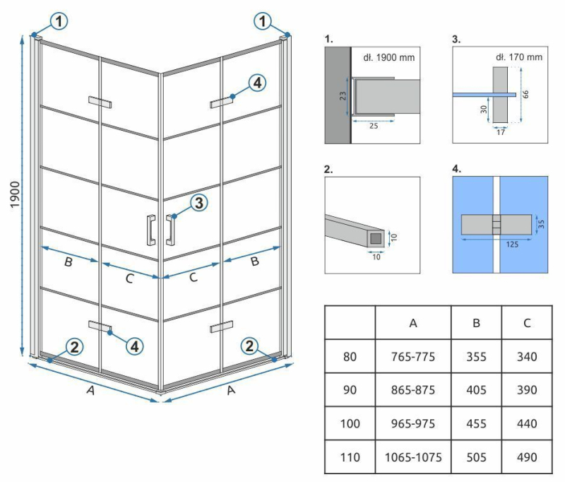 Kabina prysznicowa Molier składa się z dwóch drzwi szklanych, wykończonych eleganckimi elementami w kolorze czarny mat. Model ten jest idealnym rozwiązaniem, w niedużych i nieustawnych pomieszczeniach łazienkowych. Drzwi można złożyć na ścianę. Daje to nieograniczone możliwości w praktycznym użytkowaniu łazienki. Szkło w kabinie jest nie tylko bezpieczne, ale też praktyczne, dzięki zastosowaniu powłoki Easy Clean. Dzięki tej nowoczesnej technologii na szkle nie osadza się kamień, a czyszczenie nie wymaga użycia silnych środków. Instrukcja