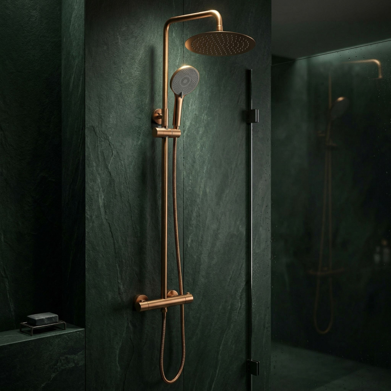 Sprchová sada Lungo s termostatem v povrchové úpravě Kartáčovaná měď (Brushed Copper) je jedinečnou nabídkou pro ty, kteří hledají armaturu s neotřelým a teplým charakterem. Hladká, minimalistická forma v kombinaci s luxusním odstínem mědi činí z této sady hlavní dekorativní prvek koupelny, který se ideálně hodí do loftového, moderního i retro stylu. Díky použití pokročilé technologie nanášení povlaku PVD armatura zaujme hloubkou barvy a dlouholetou odolností.Termostatická baterie – zaručuje konstantní teplotu vody po celou dobu koupání, což zajišťuje maximální komfort, bezpečnost a ochranu před náhlými změnami teploty.Povrchová úprava Kartáčovaná měď – ušlechtilý matný povrch s hlubokým měděným odstínem, který je velmi praktický – účinně maskuje skvrny od vody a otisky prstů.Technologia PVD – vakuová metoda nanášení povlaku zajišťuje extrémní odolnost barvy a nejvyšší rezistenci vůči poškrábání a vnějším vlivům.Minimalistický design Lungo – čisté, válcové linie bez zbytečných ozdob zdůrazňují moderní šmrnc sprchové zóny a usnadňują údržbu.Kompletní sprchový systém – sada obsahuje velkou, štíhlou dešťovou sprchu a ergonomickou ruční sprchu, nabízející relaxační proud vody přizpůsobený vašim potřebám.Konstrukce bez výtoku – sada určená pro sprchy působí lehce a zabírá optimálně málo místa, což umožňuje plnou svobodu pohybu při koupeli.Materiály třídy Premium – robustní mosazné tělo a vysoce kvalitní vnitřní komponenty zaručují bezporuchový provoz a plnou těsnost sady.