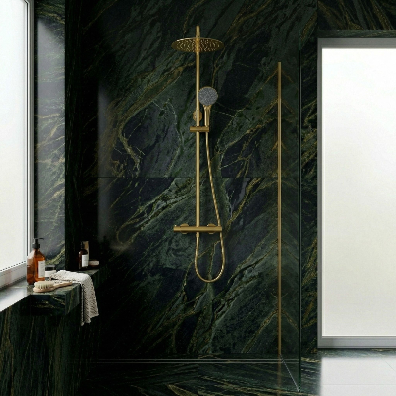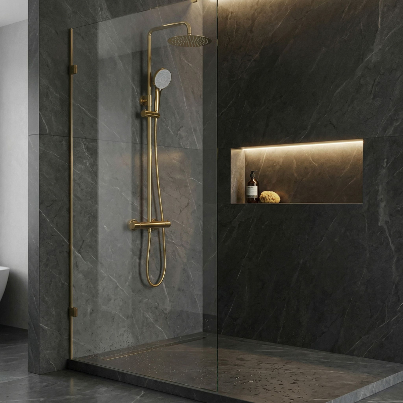 Sprchová sada Lungo s termostatem v povrchové úpravě Zlatá je kvintesencí luxusu a šperkovým doplňkem vaší koupelny. Klasická, hladká forma série Lungo v kombinaci se zrcadlovým zlatým leskem vytváří sadu, která přitahuje pohled a dodává interiéru prestižní charakter. Díky použití pokročilé technologie Electroplating armatura zaujme bezchybným povrchem a hloubkou barvy.Termostatická baterie – zajišťuje konstantní, ideálně zvolenou teplotu vody a zaručuje bezpečné koupání bez rizika náhlých výkyvů horka či chladu.Zlatá povrchová úprava – lesklý, hladký povrch, který krásně odráží světlo, opticky rozjasňuje sprchovou zónu a dodává jí eleganci ve stylu Glamour.Galvanická technologie (Electroplating) – zaručuje vysokou odolnost proti mechanickému poškození, korozi a zajišťuje trvanlivost zlatého povrchu na dlouhá léta.Minimalistický design Lungo – válcové, štíhlé tvary bez zbytečných detailů zdůrazňují moderní styl a zajišťují, že se sada velmi snadno udržuje v čistotě.Kompletní sprchový systém – sada obsahuje velkou, ultra tenkou dešťovou sprchu a ladící sprchovou hlavici, které nabízejí luxusní proud vody.Konstrukce bez výtoku – určená pro instalaci do sprchového koutu, sada zabírá minimum místa a dodává celému uspořádání moderní a lehký vzhled.Solidní materiály – tělo z vysoce kvalitní mosazi a keramická kartuše zajišťují plnou těsnost a bezporuchový provoz po celá léta.