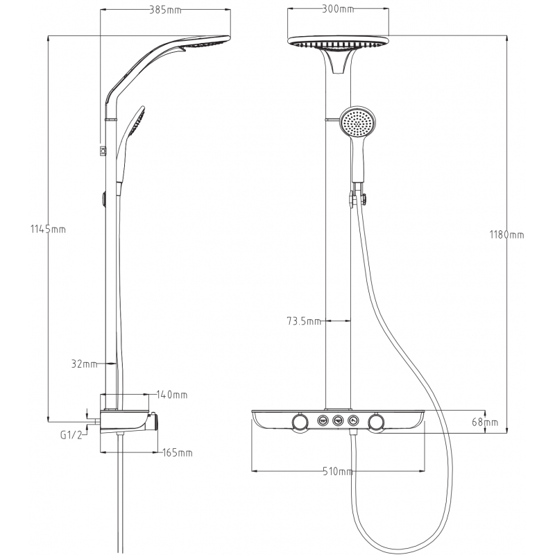 Specifikace produktu: Materiál sloupku: Hliník Povrchová úprava sloupku: Bílá/Chrom Výška: 1145 mm Šířka sloupku: 73,5 mm Vzdálenost od zdi: 385 mm Materiál sprchové hlavice: ABS Počet funkcí: 2 Povrchová úprava sprchové hlavice: Bílá/Chrom Materiál rukojeti: ABS Povrchová úprava rukojeti: Bílá/Chrom Počet funkcí: 1 Materiál hadice: PVC Povrchová úprava hadice: Chrom Délka hadice: 150 cm Mosazné koncovky Hladký povrch usnadňuje čištění Otočné koncovky zabraňují kroucení Flexibilní materiál odolný vůči natahování a ohýbání Materiál baterie: Mosazné tělo Povrchová úprava baterie: Bílá/Chrom Počet funkcí: 3 Praktická skleněná polička na kosmetiku