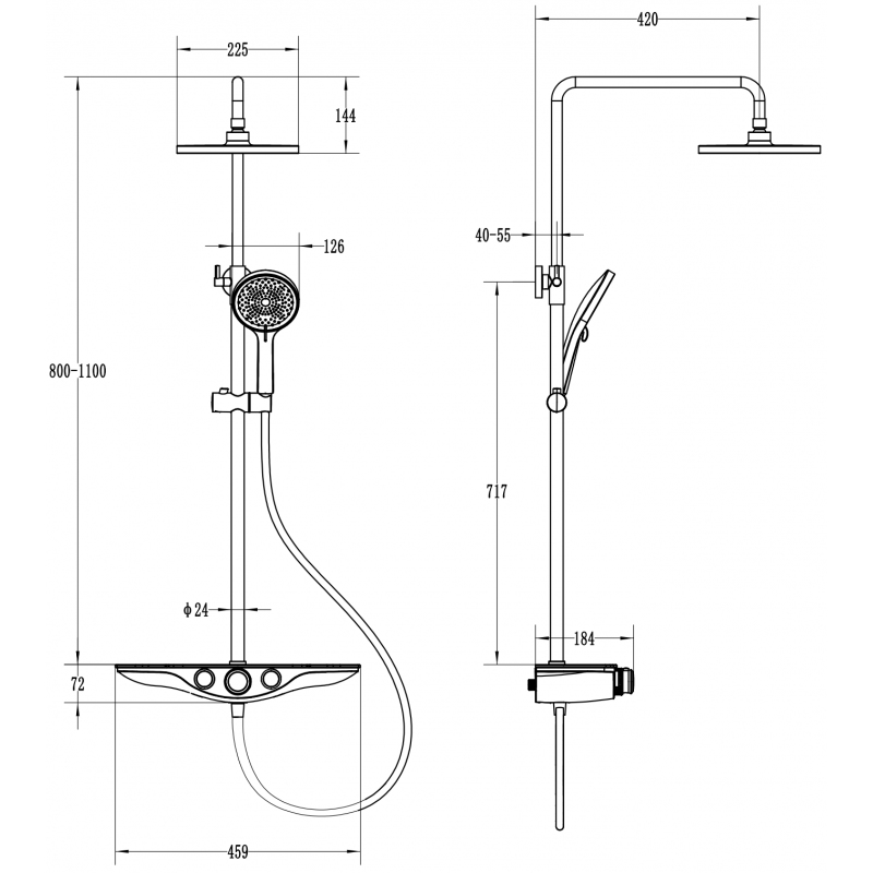 Specifikace produktu: Materiál sloupku: Nerezová ocel Povrchová úprava sloupku: Chrom Výška: 800-1100 mm Šířka sloupku: ø24 mm Vzdálenost od zdi: 420 mm Posuvný držák ruční sprchy Materiál sprchové hlavice: ABS Povrchová úprava sprchové hlavice: Chrom/Černá Velikost sprchové hlavice: ø225 mm Materiál ruční sprchy: ABS Povrchová úprava ruční sprchy: Chrom/Černá Počet funkcí: 3 Materiál hadice: PVC Povrchová úprava hadice: Chrom Délka hadice: 150 cm Mosazné koncovky Hladký povrch usnadňuje údržbu Otočné koncovky zabraňují kroucení Flexibilní materiál odolný vůči natahování a ohýbání Materiál baterie: Mosazné tělo Povrchová úprava baterie: Chrom/Černá Počet funkcí: 2 Praktická skleněná polička na kosmetiku