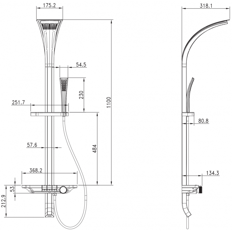 Specifikace produktu: Materiál sloupku: Hliník Povrchová úprava sloupku: Černá Výška: 1312,9 mm Šířka sloupku: 57,6 mm Vzdálenost od zdi: 318,1 mm Materiál sprchové hlavice: ABS Povrchová úprava sprchové hlavice: Černá Materiál rukojeti: ABS Povrchová úprava rukojeti: Černá Počet funkcí: 1 Materiál hadice: PVC Povrchová úprava hadice: Černá Délka hadice: 150 cm Mosazné koncovky Hladký povrch usnadňuje údržbu Otočné koncovky zabraňují kroucení Flexibilní materiál odolný vůči natahování a ohýbání Materiál baterie: Mosazné tělo Povrchová úprava baterie: Černá Počet funkcí: 3 Výpust umístěná ve spodní části baterie Praktická skleněná polička na kosmetiku