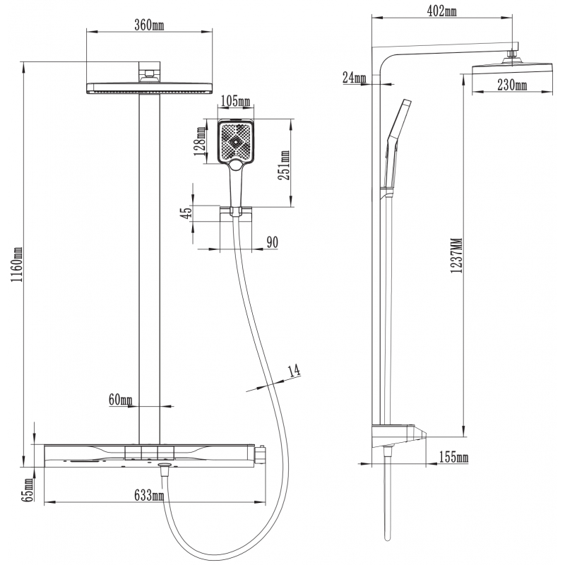 Specifikace produktu: Materiál sloupku: Hliník Povrchová úprava sloupku: Černá Výška: 1160 mm Šířka sloupku: 60 mm Vzdálenost od zdi: 402 mm Materiál sprchové hlavice: ABS Povrchová úprava sprchové hlavice: Černá Velikost sprchové hlavice: 230 x 360 mm Materiál ruční rukojeti: ABS Povrchová úprava ruční rukojeti: Černá Počet funkcí: 3 Materiál hadice: PVC Povrchová úprava hadice: Černá Délka hadice: 150 cm Mosazné koncovky Hladký povrch usnadňuje údržbu Otočné koncovky zabraňují kroucení Flexibilní materiál odolný proti natahování a ohýbání Materiál baterie: Mosazné tělo Povrchová úprava baterie: Černá Šířka baterie: 633 mm Počet funkcí: 3 Praktická skleněná polička na kosmetiku Tlak vody nelze regulovat, proud se zapíná a vypíná funkcí ON-OFF
