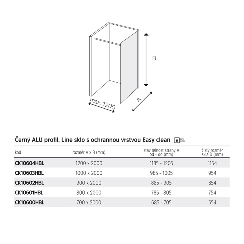 Hliníkové profily v barvě black, sklo Line, síla skla 8 mm, WALK IN, rozměr 1000 mm, výška 2000 mm.. Zobrazit více