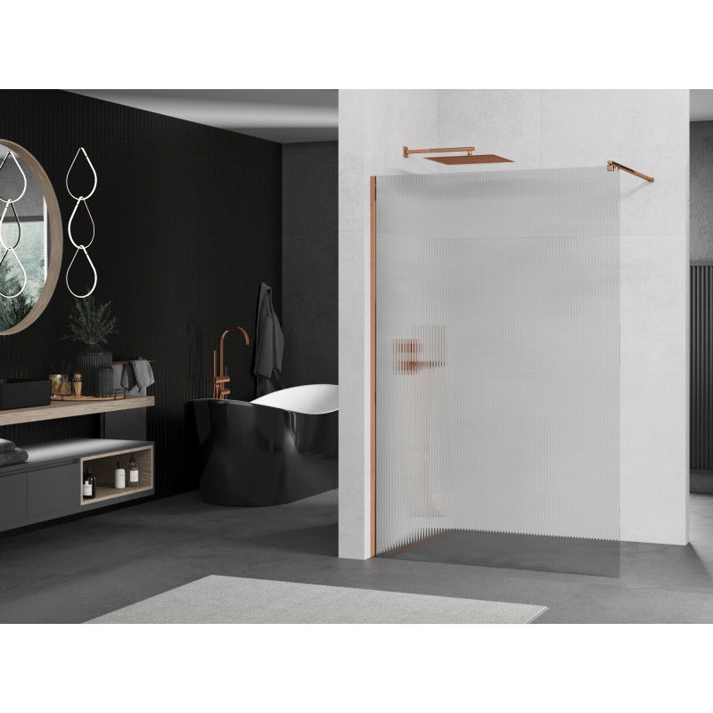 Technické údaje: Šířka: 140 cm Výška: 200 cm Montáž: Univerzální, pravá nebo levá Barva skla: Pruhované Povrchová úprava: Růžové zlato Typ skla: Tvrzené Tloušťka skla: 8 mm Profil: Hliník Konzola: Nerezová ocel Max. délka konzoly: 150 cm Konzolu lze zkrátit Povrchová úprava pro snadné čištění Vyrovnává nerovnosti stěny Možnost montáže na sprchovou vaničku nebo dlaždice