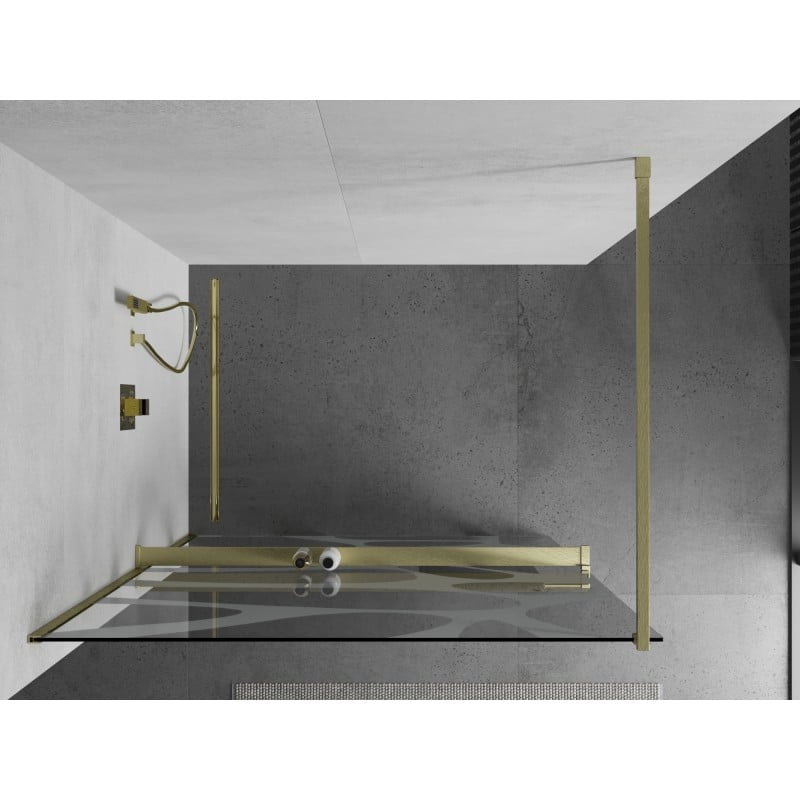 Specifikace produktu: Šířka: 110 cm Výška: 200 cm Montáž: Univerzální, pravá nebo levá Barva skla: Bílá vlna Povrchová úprava: Kartáčované zlato Typ skla: Tvrzené Tloušťka skla: 8 mm Profil: Hliník Konzola: Nerezová ocel Max. délka konzoly: 150 cm Materiál police: Hliník Šířka: 12,9 cm Výška: 3,2 cm Max. délka police: 140 cm Možnost zkrácení konzoly a police Povlak pro snadné čištění Vyrovnání nerovností stěny Možnost montáže na sprchovou vaničku nebo obklady