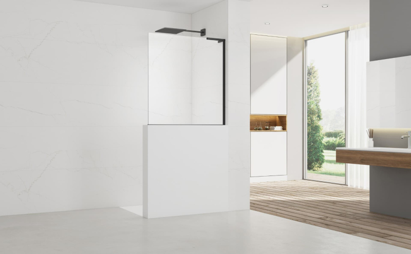 Sprchová zástěna walk-in s profilem a L-zavětrováním v černé barvě, výplň je z čirého skla bez dekoru. Produkt je opatřen povrchovou úpravou Easy Clean, která usnadňuje čistění a minimalizuje usazování vodního kamene. Nelze otevřít - pevný systém. Určení - pravá orientace.