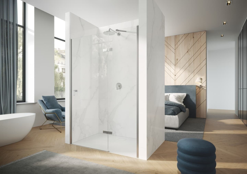 Sprchové dveře bez vaničky a barvou profilů v lesklém chromu, výplň je z čirého skla bez dekoru. Produkt je opatřen technologií Hüppe Anti-Plaque - povrchová úprava aplikovaná ve výrobě, která usnadňuje čištění a umožňuje jednoduché stékání vody v podobně drobných kapek. Pantový systém otevírání. Určení - pravá orientace.