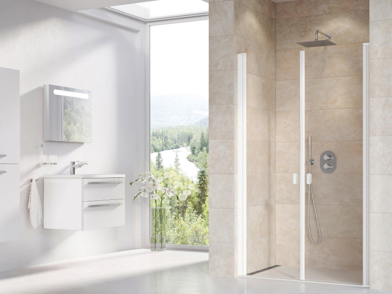 Dvoudílné sprchové dveře Chrome v bílém matném provedení a s výplní z čirého skla s ochrannou vrstvou Ravak AntiCalc®. Otočný systém otevírání.