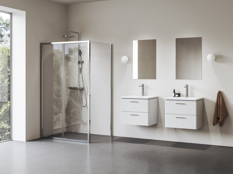 Dvoudílné sprchové dveře Blix II v provedení lesklý chrom a s výplní z čirého skla s ochrannou vrstvou Ravak AntiCalc®. Posuvný systém otevírání. Otočitelný výrobek pro levou i pravou variantu.