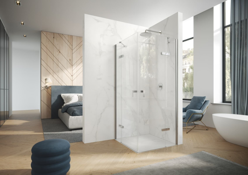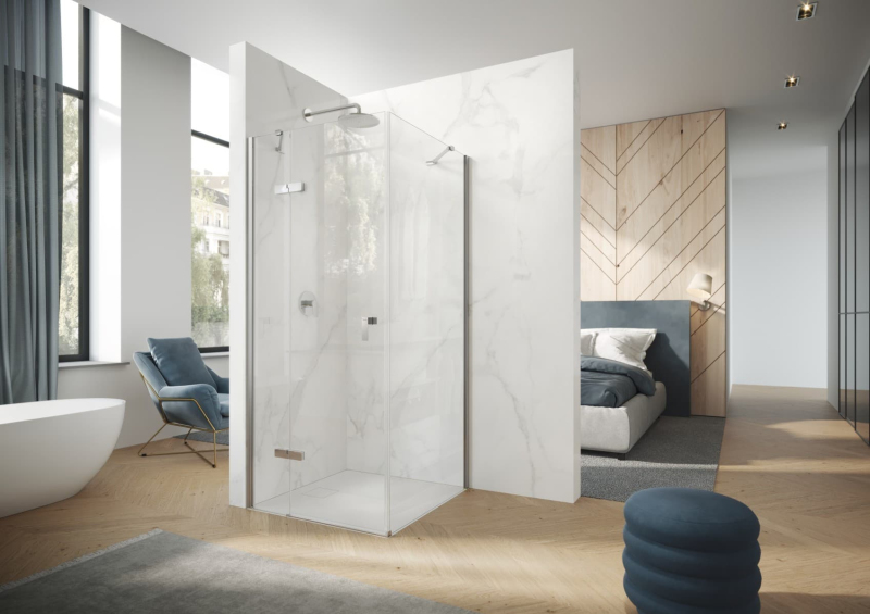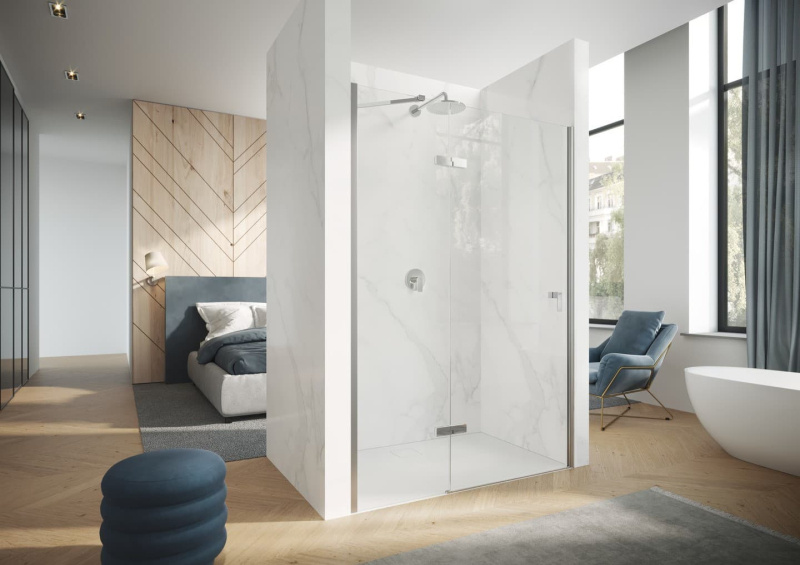 Sprchové dveře bez vaničky a barvou profilů v lesklém chromu, výplň je z čirého skla bez dekoru. Produkt je opatřen technologií Hüppe Anti-Plaque - povrchová úprava aplikovaná ve výrobě, která usnadňuje čištění a umožňuje jednoduché stékání vody v podobně drobných kapek. Pantový systém otevírání. Určení - levá orientace.