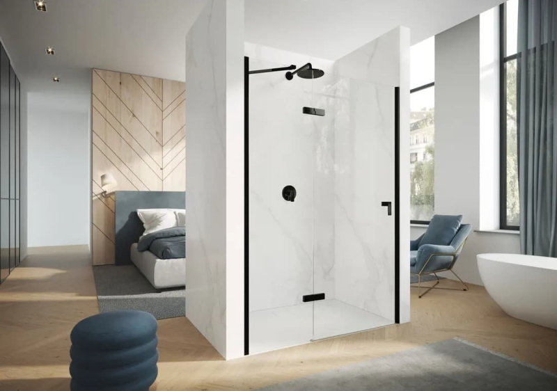 Sprchové dveře bez vaničky a barvou profilů v černém matném provedení, výplň je z čirého skla bez dekoru. Produkt je opatřen technologií Hüppe Anti-Plaque - povrchová úprava aplikovaná ve výrobě, která usnadňuje čištění a umožňuje jednoduché stékání vody v podobně drobných kapek. Pantový systém otevírání. Určení - levá orientace.