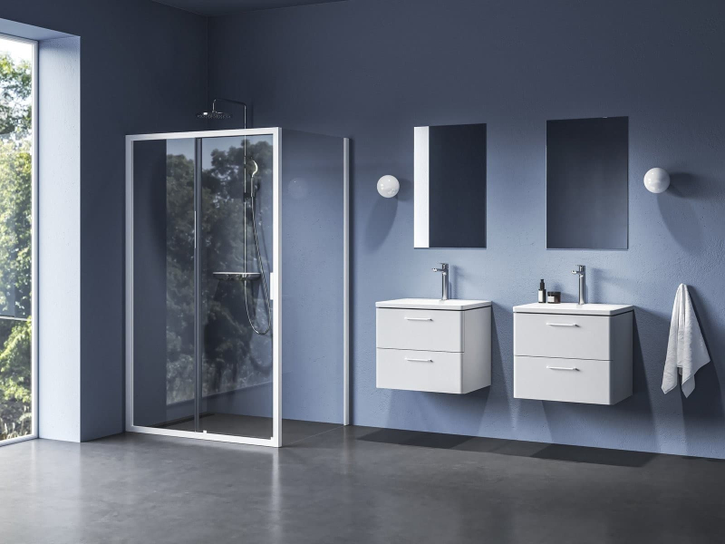 Dvoudílné sprchové dveře Blix II v bílém matném provedení a s výplní z čirého skla s ochrannou vrstvou Ravak AntiCalc®. Posuvný systém otevírání. Otočitelný výrobek pro levou i pravou variantu.