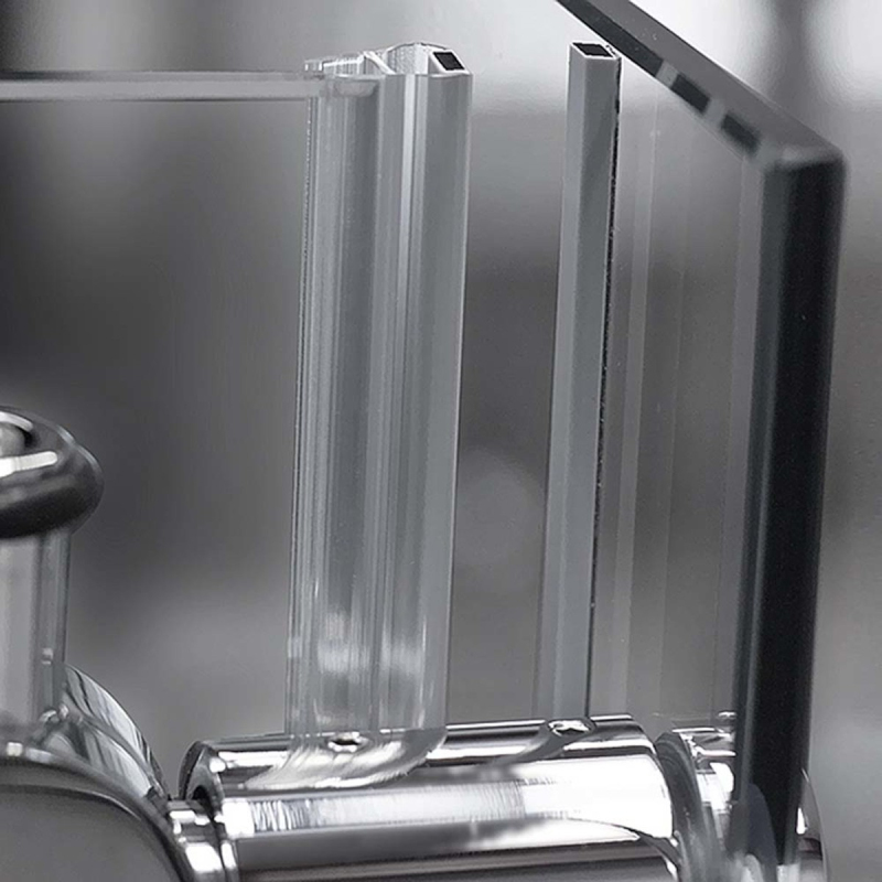 Sprchové dveře bez vaničky a barvou profilů v lesklém chromu, výplň je z čirého skla bez dekoru. Produkt je opatřen povrchovou úpravou Rolshield je sklo chráněno před usazováním všech nečistot a jeho údržba je snadnější než kdy dřív. Posuvný systém otevírání. Levá i pravá orientace.