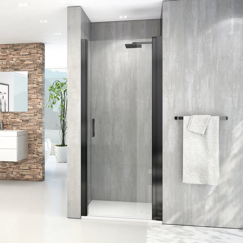 Sprchové dveře bez vaničky a barvou profilů v černé barvě, výplň je z čirého skla bez dekoru. S povrchovou úpravou RothETC, která zajišťuje jednodušší čištění skla díky svému voděodpudivému efektu. Po takto ošetřeném sklu stéká voda v pramíncích ihned pryč a bere sebou většinu nečistot i vodního kamene. Otočný systém otevírání. Určení - levá i pravá orientace.