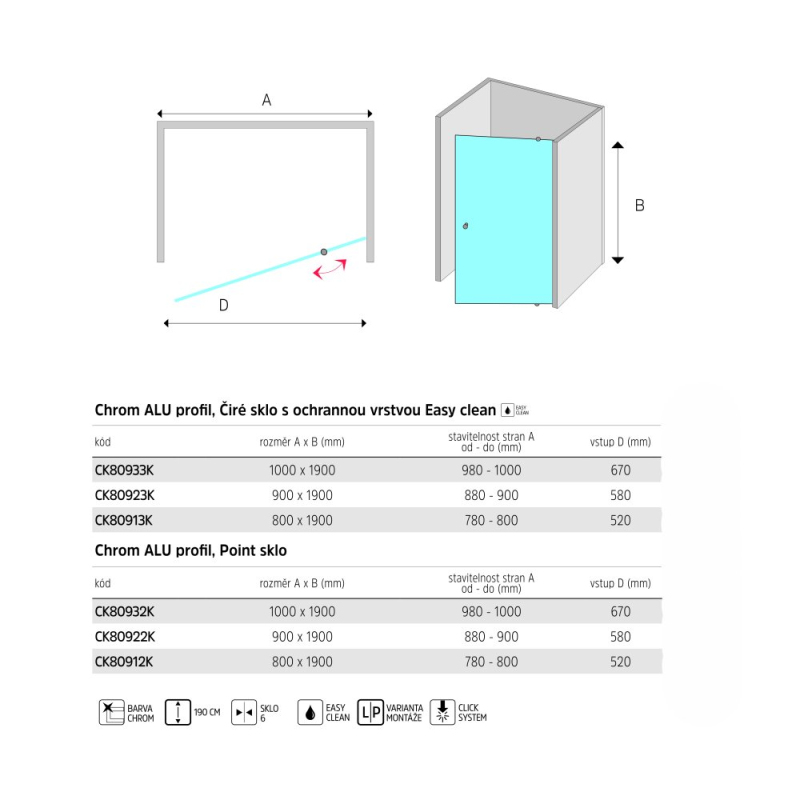 Hliníkové profily v barvě chrom, dveře pivotové, sklo Čiré, síla skla 6 mm, rozměr 900 mm, výška 1900 mm.. Zobrazit více