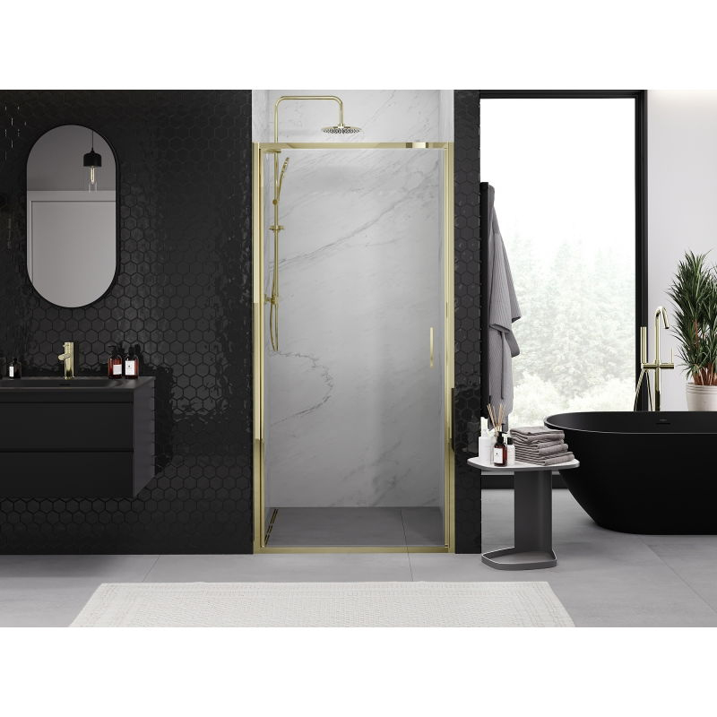 Specifikace produktu: Rozměr: 100x200 cm Montáž: Univerzální Vstup: S panty Barva skla: Průhledná Typ skla: Tvrzené Tloušťka skla: 6 mm Profil: Hliník Povrchová úprava: Zlatý nátěr pro snadné čištění Vyrovnání nerovností stěny Nastavení šířky Možnost montáže na sprchovou vaničku nebo obklady Kovová rukojeť Sada těsnění pro odvod vody Hliníkový práh pro těsnění dveří