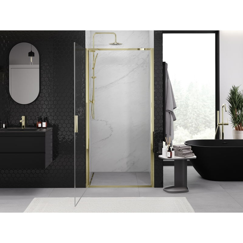 Specifikace produktu: Rozměr: 65x200 cm Montáž: Univerzální Vstup: S panty Barva skla: Průhledná Typ skla: Tvrzené Tloušťka skla: 6 mm Profil: Hliník Povrchová úprava: Zlatý nátěr pro snadné čištění Vyrovnání nerovností stěny Nastavení šířky Možnost montáže na sprchovou vaničku nebo obklady Kovová rukojeť Sada těsnění pro odvod vody Hliníkový práh pro těsnění dveří