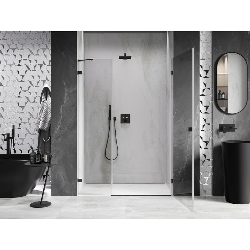 Specifikace produktu: Rozměr: 150x200 cm Strana montáže: Pravá Vchod: Otevíravý Barva skla: Průhledná Povrchová úprava: Černá Profil: Hliník Typ skla: Tvrzené Tloušťka skla: dveře 6 mm, stěna 8 mm Povlak pro snadné čištění Možnost nastavení šířky Dva montážní systémy: - S profilem, který umožňuje vyrovnání nerovností stěn - Bez profilu v případě dokonale rovných stěn Možnost montáže na sprchovou vaničku nebo obklady Mechanismus pro zvedání a spouštění dveří Mosazné svorky v jedné rovině se skleněnou tabulí Magnetický proužek a elastomerové těsnění pro odvod vody Hliníkový práh těsnění dveří