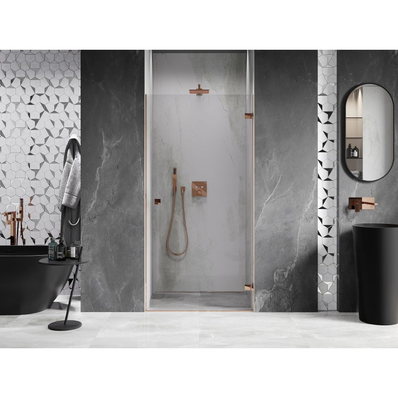 Specifikace produktu: Rozměr: 85x200 cm Strana montáže: Pravá Vchod: Otevíravý Barva skla: Průhledná Povrchová úprava: Růžové zlato Profil: Hliník Typ skla: Tvrzené Tloušťka skla: 6 mm Povrchová úprava pro snadné čištění Možnost nastavení šířky Dva montážní systémy: - S profilem, který umožňuje vyrovnání nerovností stěn - Bez profilu pro dokonale rovné stěny Možnost montáže na sprchovou vaničku nebo obklady Mechanismus pro zvedání a spouštění dveří Mosazné svorky v jedné rovině se skleněnou tabulí Magnetický proužek a elastomerové těsnění pro odvod vody Hliníkový práh těsnění dveří