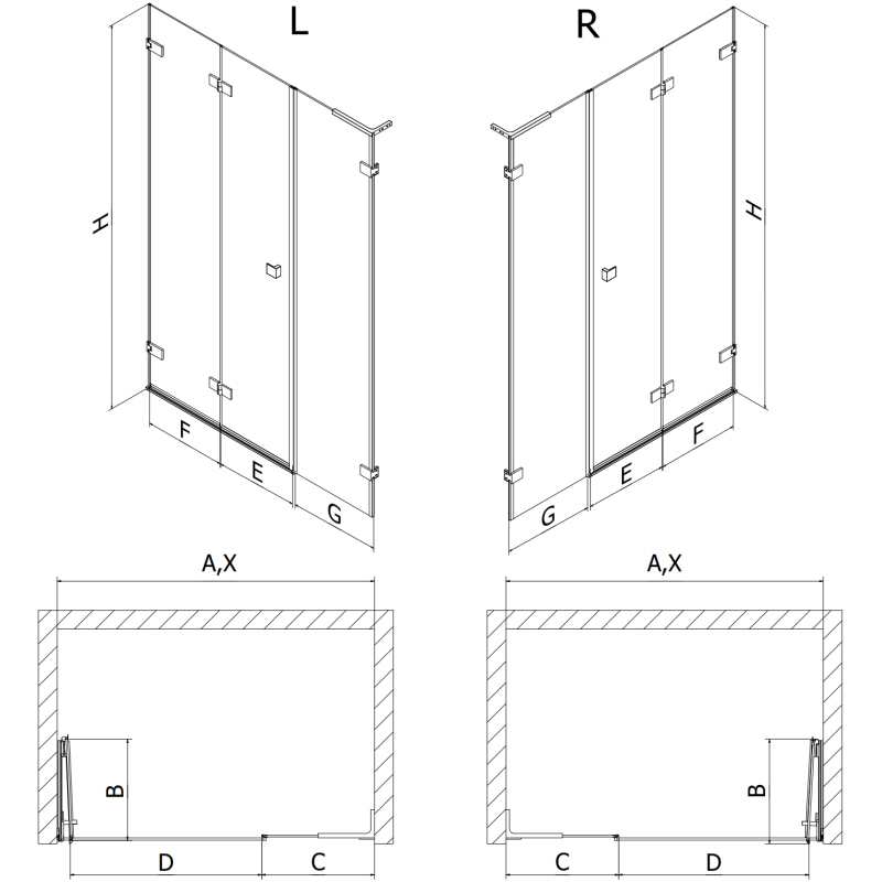 Specifikace produktu: Rozměr: 120x200 cm Strana montáže: Levá Vchod: Skládací Barva skla: Průhledná Povrchová úprava: Chrom Profil: Hliník Stabilizátor ve tvaru L: Nerezová ocel Typ skla: Tvrzené Tloušťka skla: dveře 6 mm, stěna 8 mm Povlak pro snadné čištění Možnost nastavení šířky Dva montážní systémy: - S profilem, který umožňuje vyrovnání nerovností stěn - Bez profilu v případě dokonale rovných stěn Možnost montáže na sprchovou vaničku nebo obklady Mosazné svorky a panty v jedné rovině se skleněnou tabulí Magnetický proužek a elastomerové těsnění pro odvod vody Hliníkový práh těsnění dveří