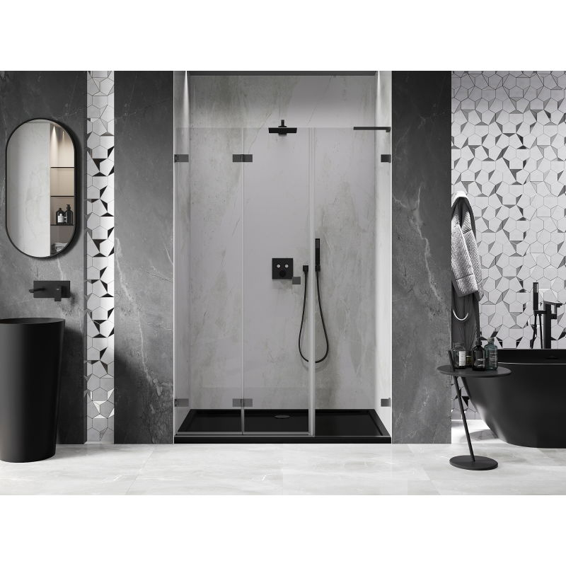 Specifikace produktu: Rozměr: 125x200 cm Strana montáže: Levá Vchod: Skládací Barva skla: Průhledná Povrchová úprava: Těsněná Profil: Hliník Stabilizátor ve tvaru L: Nerezová ocel Typ skla: Tvrzené Tloušťka skla: dveře 6 mm, stěna 8 mm Povlak pro snadné čištění Možnost nastavení šířky Dva montážní systémy: - S profilem, který umožňuje vyrovnání nerovností stěn - Bez profilu v případě dokonale rovných stěn Možnost montáže na sprchovou vaničku nebo obklady Mosazné svorky a panty v jedné rovině se skleněnou tabulí Magnetický proužek a elastomerové těsnění pro odvod vody Hliníkový práh těsnění dveří