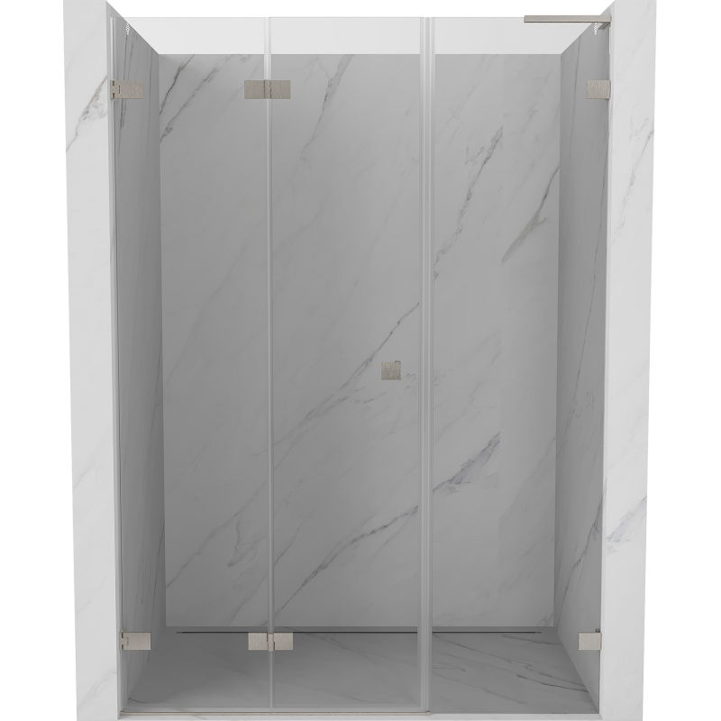 Specifikace produktu: Rozměr: 140x200 cm Strana montáže: Levá Vchod: Skládací Barva skla: Průhledná Povrchová úprava: Kartáčovaný nikl Profil: Hliník Stabilizátor ve tvaru L: Nerezová ocel Typ skla: Tvrzené Tloušťka skla: dveře 6 mm, stěna 8 mm Povlak pro snadné čištění Možnost nastavení šířky Dva montážní systémy: - S profilem, který umožňuje vyrovnání nerovností stěn - Bez profilu pro dokonale rovné stěny Možnost montáže na sprchovou vaničku nebo obklady Mosazné svorky a panty v jedné rovině se skleněnou tabulí Magnetický proužek a elastomerové těsnění pro odvod vody Hliníkový práh těsnění dveří