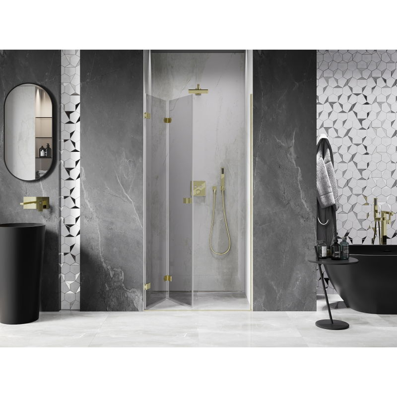 Specifikace produktu: Rozměr: 60x200 cm Strana montáže: Levá Vchod: Skládací Barva skla: Průhledná Povrchová úprava: Kartáčované zlato Profil: Hliník Typ skla: Tvrzené Tloušťka skla: 6 mm Povrchová úprava pro snadné čištění Nastavitelná šířka Dva montážní systémy: - S profilem, který umožňuje vyrovnání nerovností stěn - Bez profilu pro dokonale rovné stěny Možnost montáže na sprchovou vaničku nebo obklady Mosazné svorky a panty v jedné rovině se skleněnou tabulí Magnetický proužek a elastomerové těsnění pro odvod vody Hliníkový práh těsnění dveří