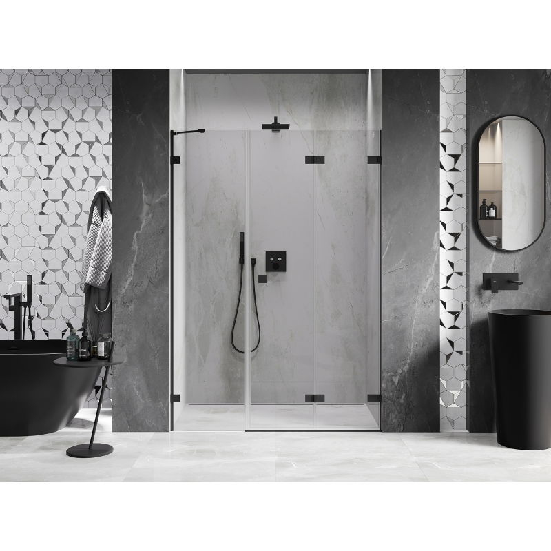 Specifikace produktu: Rozměr: 115x200 cm Strana montáže: Pravá Vchod: Skládací Barva skla: Průhledná Povrchová úprava: Černá Profil: Hliník Typ skla: Tvrzené Tloušťka skla: dveře 6 mm, stěna 8 mm Povlak pro snadné čištění Možnost nastavení šířky Dva montážní systémy: - S profilem, který umožňuje vyrovnání nerovností stěn - Bez profilu v případě dokonale rovných stěn Možnost montáže na sprchovou vaničku nebo obklady Mosazné svorky a panty v jedné rovině se skleněnou tabulí Magnetický proužek a elastomerové těsnění pro odvod vody Hliníkový práh těsnění dveří