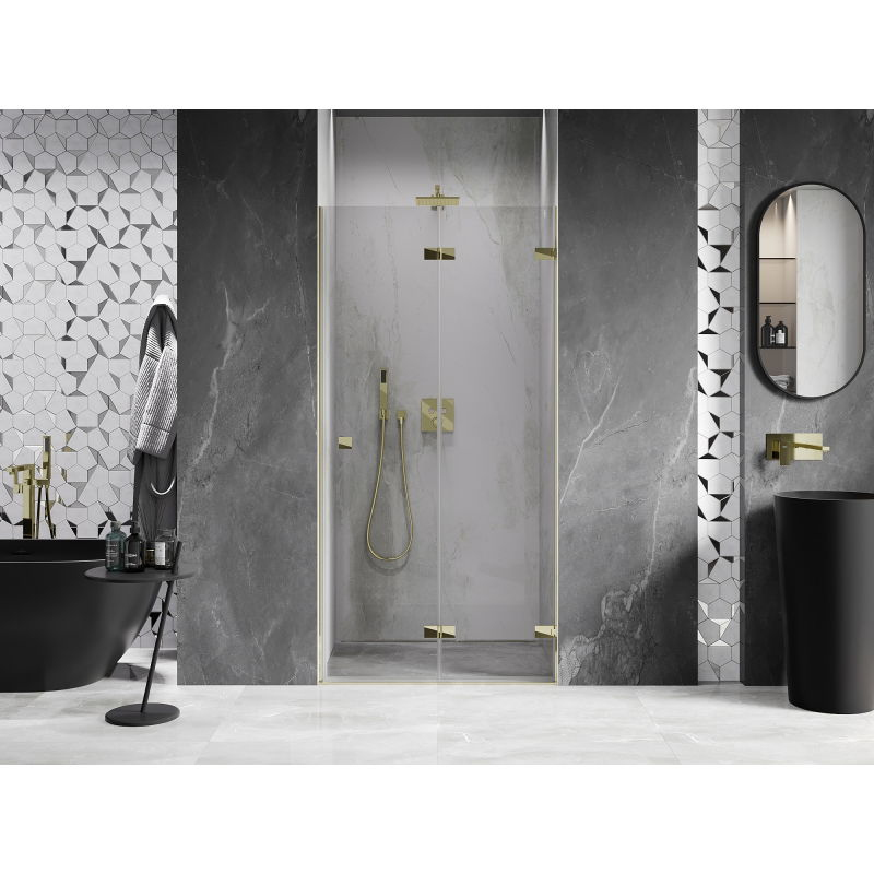 Specifikace produktu: Rozměr: 65x200 cm Strana montáže: Pravá Vchod: Skládací Barva skla: Průhledná Povrchová úprava: Zlatá Profil: Hliník Typ skla: Tvrzené Tloušťka skla: 6 mm Povrchová úprava pro snadné čištění Možnost nastavení šířky Dva montážní systémy: - S profilem, který umožňuje vyrovnání nerovností stěn - Bez profilu v případě dokonale rovných stěn Možnost montáže na sprchovou vaničku nebo obklady Mosazné svorky a panty v jedné rovině se skleněnou tabulí Magnetický proužek a elastomerové těsnění pro odvod vody Hliníkový práh těsnění dveří