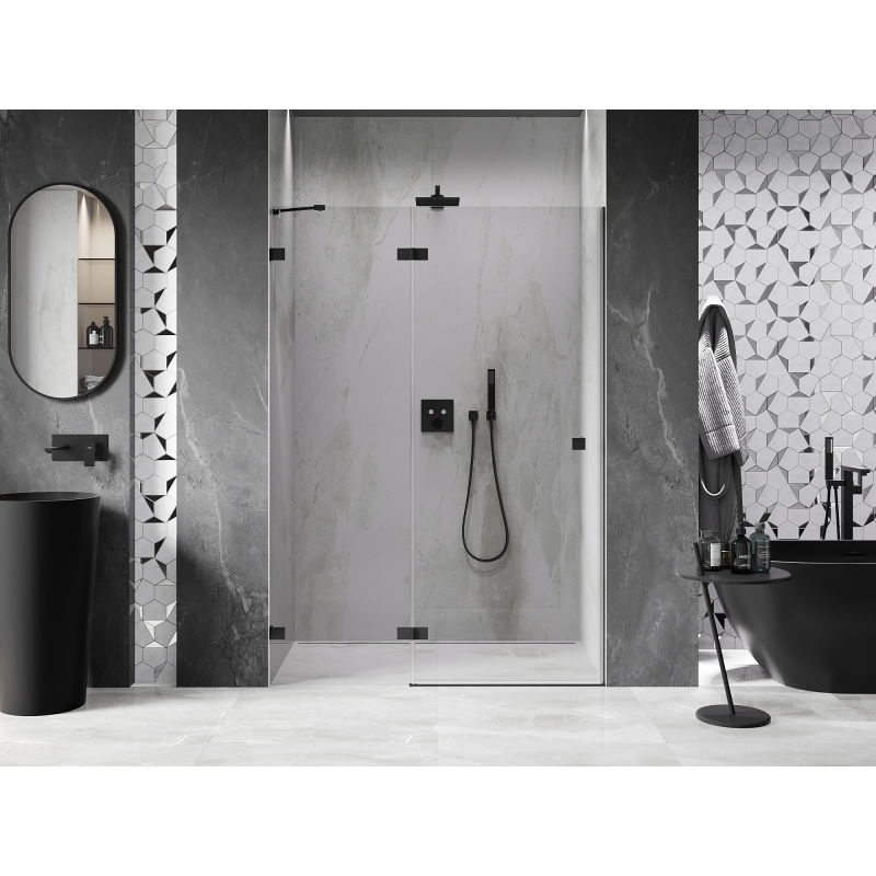 Specifikace produktu: Rozměr: 140x200 cm Strana montáže: Levá Vchod: Otevíravý Barva skla: Průhledná Povrchová úprava: Černá Profil: Hliník Konzola: Nerezová ocel Typ skla: Tvrzené Tloušťka skla: 8 mm Povrchová úprava pro snadné čištění Možnost nastavení šířky Dva montážní systémy: - S profilem, který umožňuje vyrovnání nerovností stěny - Bez profilu pro dokonale rovné stěny Možnost montáže na sprchovou vaničku nebo obklady Mechanismus pro zvedání a spouštění dveří Mosazné svorky a panty v jedné rovině se skleněnou tabulí Magnetický proužek a elastomerové těsnění pro odvod vody Hliníkový práh těsnění dveří