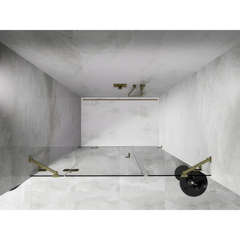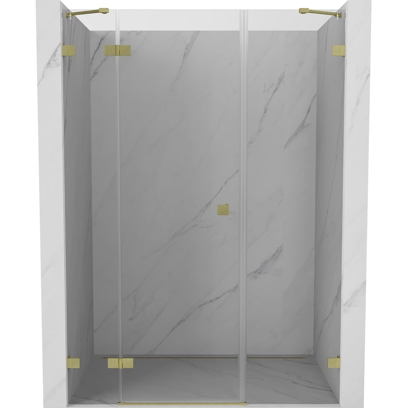 Specifikace produktu: Rozměr: 140x200 cm Strana montáže: Levá Vchod: Otevíravý Barva skla: Průhledná Povrchová úprava: Kartáčované zlato Profil: Hliník Nosná konstrukce: Nerezová ocel Typ skla: Tvrzené Tloušťka skla: 8 mm Povrchová úprava pro snadné čištění Nastavitelná šířka Dva montážní systémy: - S profilem, který umožňuje vyrovnání nerovností stěn - Bez profilu pro dokonale rovné stěny Možnost montáže na sprchovou vaničku nebo obklady Mechanismus pro zvedání a spouštění dveří Mosazné svorky a panty v jedné rovině se skleněnou tabulí Magnetický proužek a elastomerové těsnění pro odvod vody Hliníkový práh těsnění dveří