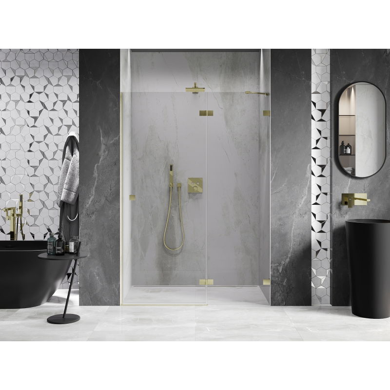 Specifikace produktu: Rozměr: 130x200 cm Strana montáže: Pravá Vchod: Otevíravý Barva skla: Průhledná Povrchová úprava: Kartáčované zlato Profil: Hliník Nosná konstrukce: Nerezová ocel Typ skla: Tvrzené Tloušťka skla: 8 mm Povrchová úprava pro snadné čištění Možnost nastavení šířky Dva montážní systémy: - S profilem, který umožňuje vyrovnání nerovností stěny - Bez profilu pro dokonale rovné stěny Možnost montáže na sprchovou vaničku nebo dlaždice Mechanismus pro zvedání a spouštění dveří Mosazné svorky a panty v jedné rovině se skleněnou tabulí Magnetický proužek a elastomerové těsnění pro odvod vody Hliníkový práh těsnění dveří