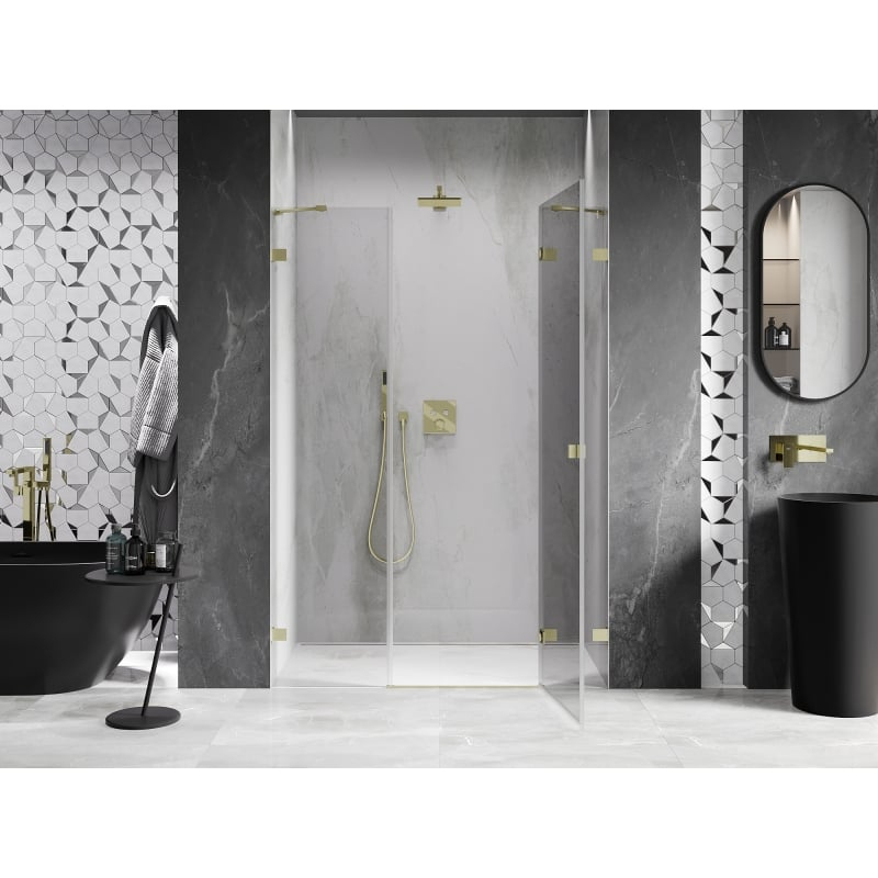 Specifikace produktu: Rozměr: 160x200 cm Strana montáže: Pravá Vchod: Otevíravý Barva skla: Průhledná Povrchová úprava: Kartáčované zlato Profil: Hliník Nosná konstrukce: Nerezová ocel Typ skla: Tvrzené Tloušťka skla: 8 mm Povrchová úprava pro snadné čištění Nastavitelná šířka Dva montážní systémy: - S profilem, který umožňuje vyrovnání nerovností stěn - Bez profilu pro dokonale rovné stěny Možnost montáže na sprchovou vaničku nebo obklady Mechanismus pro zvedání a spouštění dveří Mosazné svorky a panty v jedné rovině se sklem Magnetický proužek a elastomerové těsnění pro odvod vody Hliníkový práh těsnění dveří