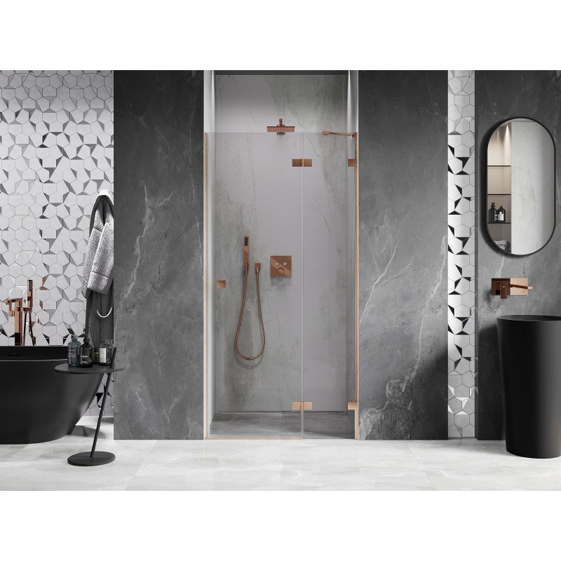 Specifikace produktu: Rozměr: 70x200 cm Strana montáže: Pravá Vchod: Otevíravý Barva skla: Průhledná Povrchová úprava: Kartáčovaná měď Profil: Hliník Nosná konstrukce: Nerezová ocel Typ skla: Tvrzené Tloušťka skla: 8 mm Povrchová úprava pro snadné čištění Nastavitelná šířka Dva montážní systémy: - S profilem, který umožňuje vyrovnání nerovností stěn - Bez profilu pro dokonale rovné stěny Možnost montáže na sprchovou vaničku nebo dlaždice Mechanismus pro zvedání a spouštění dveří Mosazné svorky a panty v jedné rovině se skleněnou tabulí Magnetický proužek a elastomerové těsnění pro odvod vody Hliníkový práh těsnění dveří