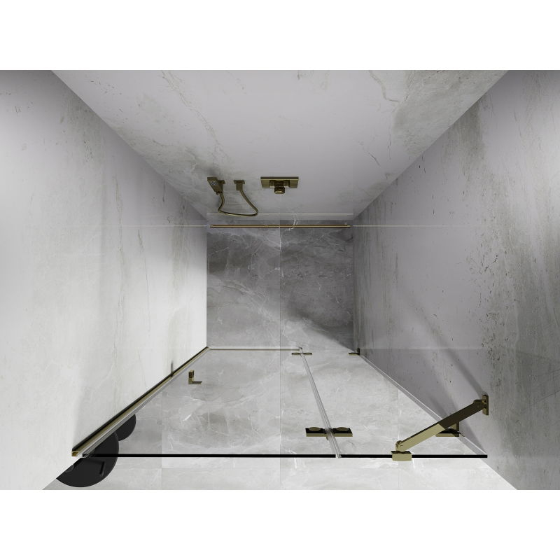 Specifikace produktu: Rozměr: 70x200 cm Strana montáže: Pravá Vchod: Otevíravý Barva skla: Průhledná Povrchová úprava: Zlatá Profil: Hliník Nosná konstrukce: Nerezová ocel Typ skla: Tvrzené Tloušťka skla: 8 mm Povrchová úprava pro snadné čištění Možnost nastavení šířky Dva montážní systémy: - S profilem, který umožňuje vyrovnání nerovností stěny - Bez profilu pro dokonale rovné stěny Možnost montáže na sprchovou vaničku nebo obklady Mechanismus pro zvedání a spouštění dveří Mosazné svorky a panty v jedné rovině se skleněnou tabulí Magnetický proužek a elastomerové těsnění pro odvod vody Hliníkový práh těsnění dveří