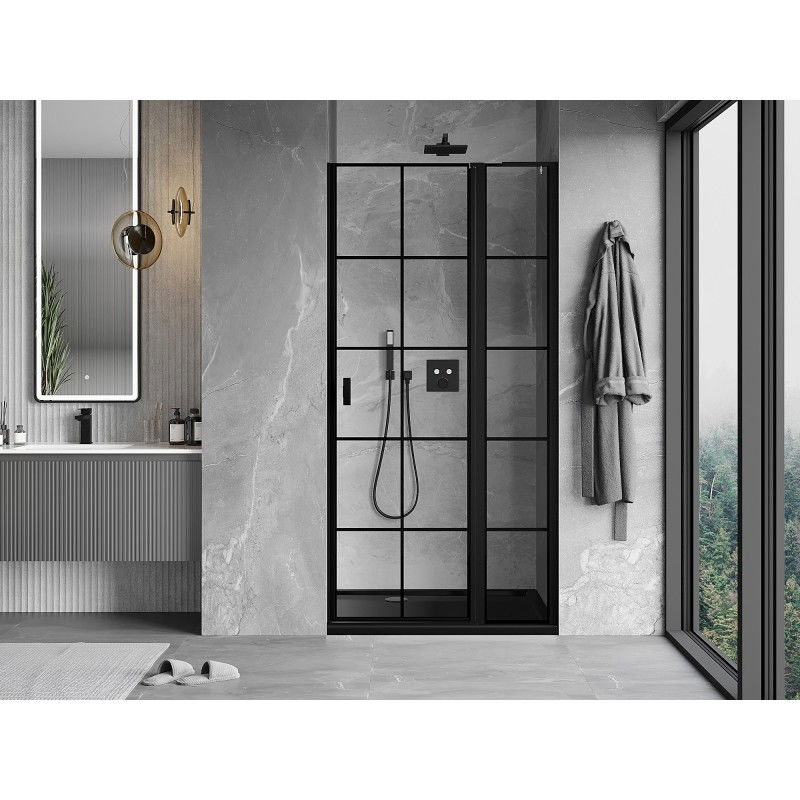 Specifikace produktu: Rozměr: 95x200 cm Strana montáže: Pravá Vchod: Výklopný Barva skla: Černá mřížka Povrchová úprava: Černá Profil: Hliník Úhlový stabilizátor L: Nerezová ocel Typ skla: Tvrzené Tloušťka skla: 6 mm Povrchová úprava pro snadné čištění Nastavitelná šířka Možnost montáže na sprchovou vaničku nebo dlaždice Mechanismus pro zvedání a spouštění dveří Magnetický proužek a elastomerové těsnění pro odtok vody Hliníkový práh těsnění dveří