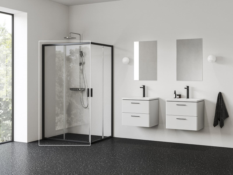 1/2 rohového sprchového koutu Blix II v černém provedení a s výplní z čirého skla s ochrannou vrstvou Ravak AntiCalc®. Posuvný systém otevírání. Kompletní sprchový kout je složen ze dvou sprchových dveří!
